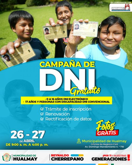 La Oficina de Registro Civil de la Municipalidad de Hualmay y el RENIEC, te invitan a participar ...