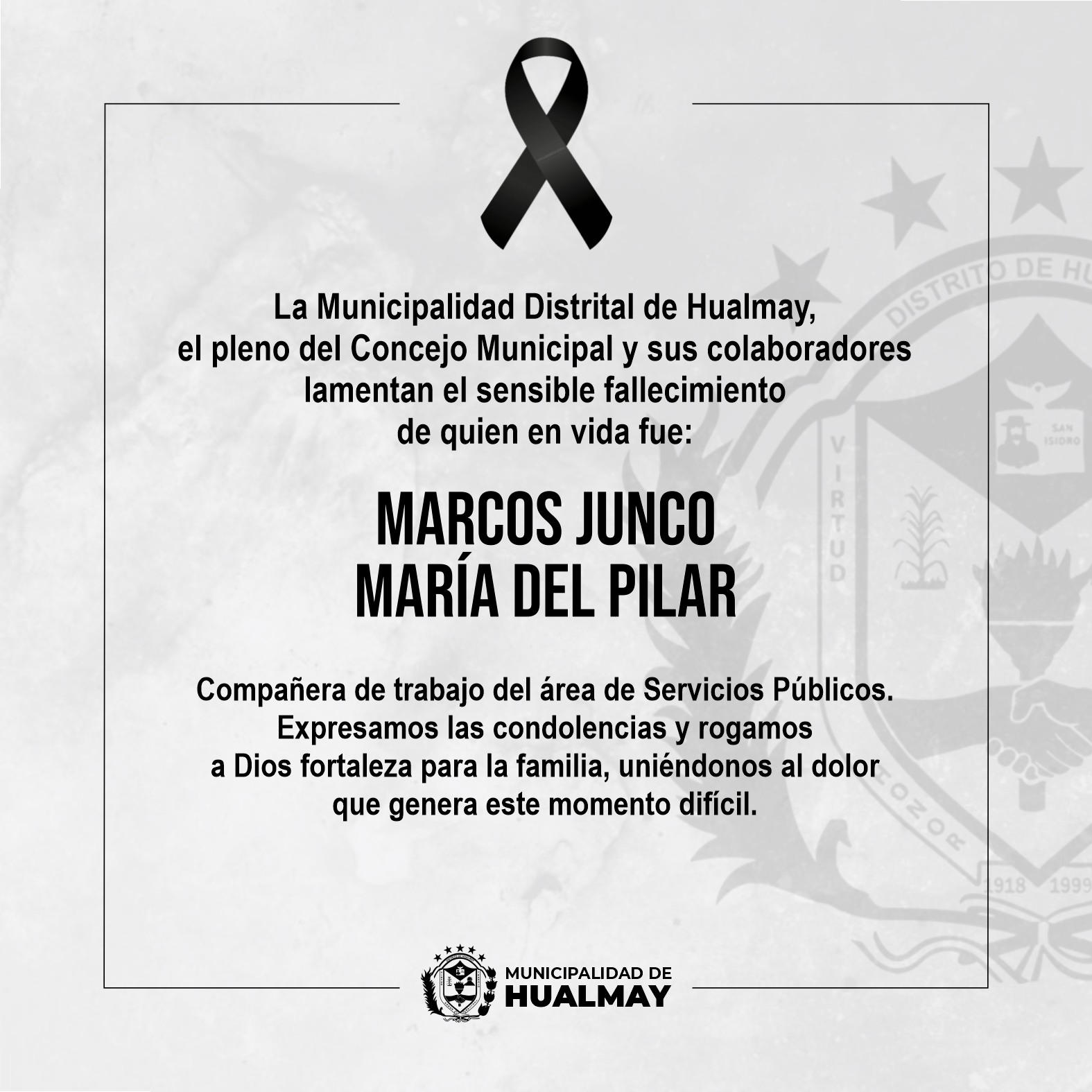 La Municipalidad Distrital de Hualmay, el pleno del Concejo Municipal y sus colaboradores lamenta...