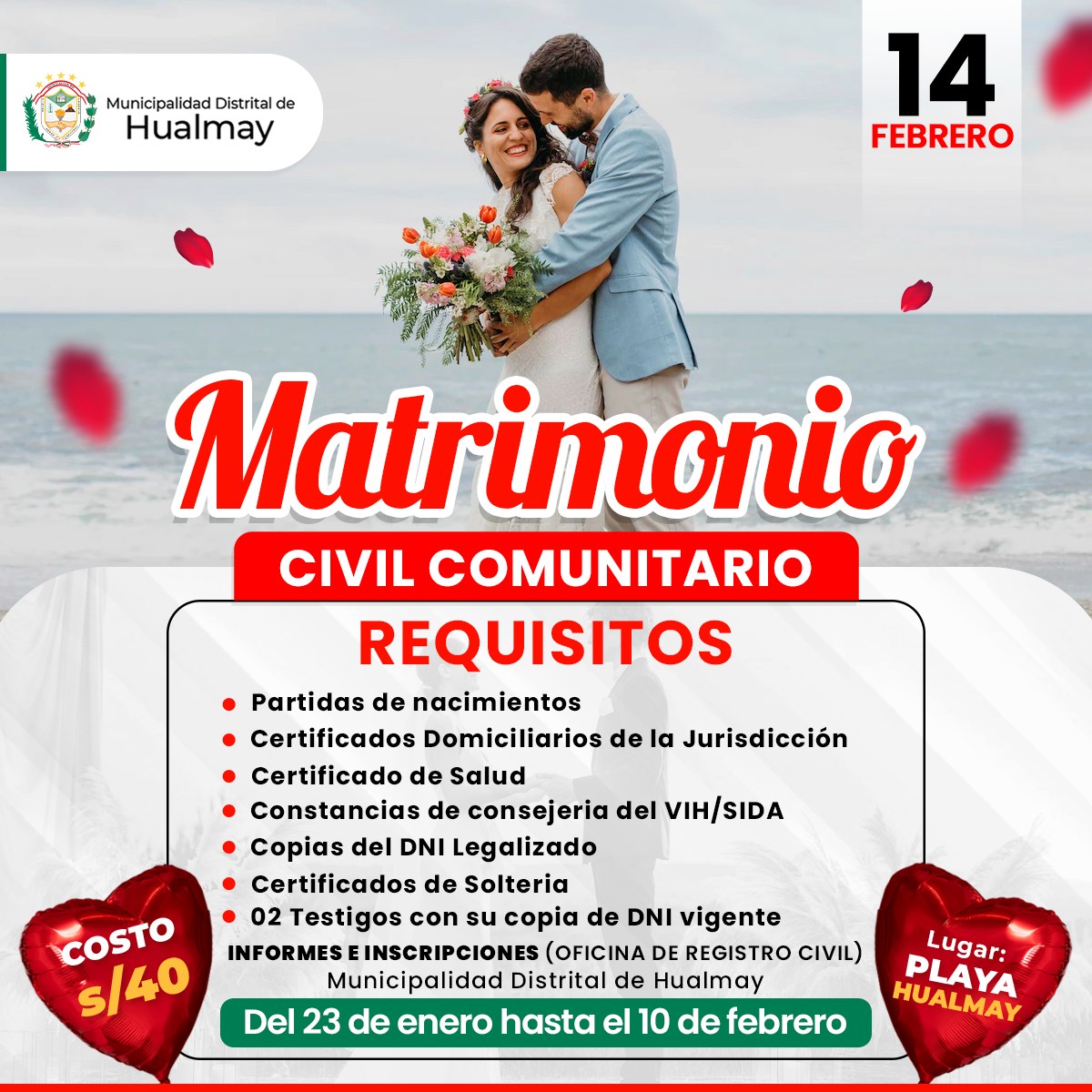 Celebrando el mes del amor, la Municipalidad Distrital de Hualmay invita a todas las parejas del ...