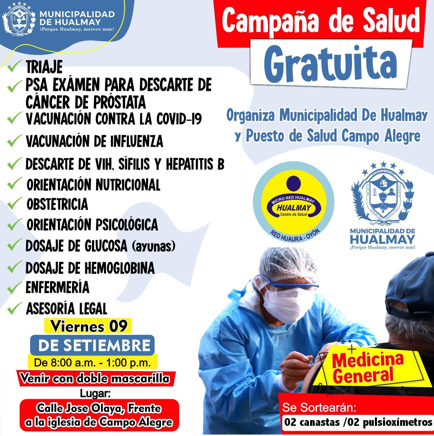 La Municipalidad Distrital De Hualmay te invita a la CAMPAÑA GRATUITA DE SALUD...