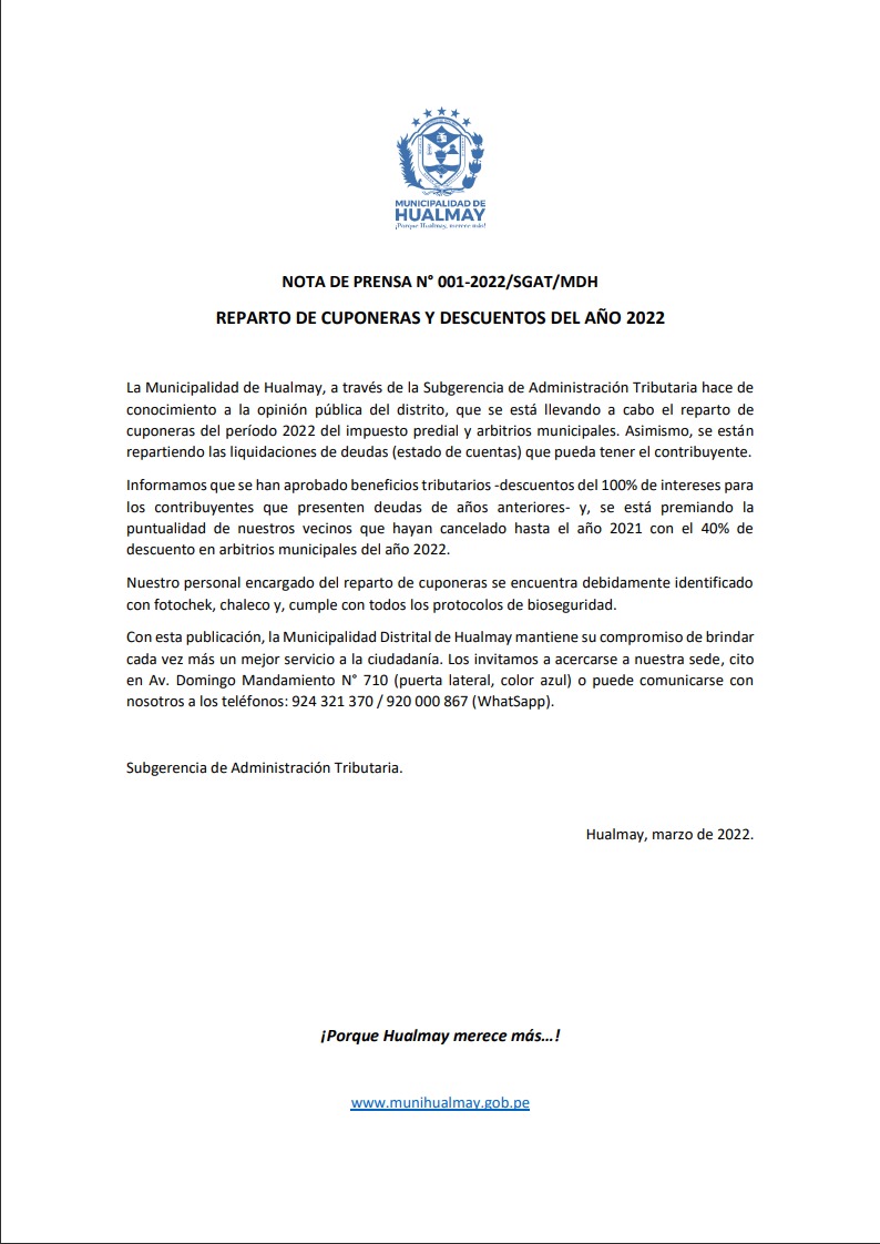 La Municipalidad de Hualmay, a través de la Subgerencia de Administración Tributaria hace de conoc...